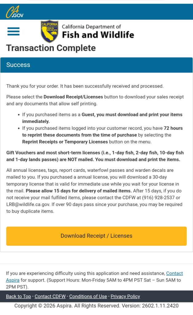 例えば、カリフォルニア州のフィッシングライセンスを購入する場合